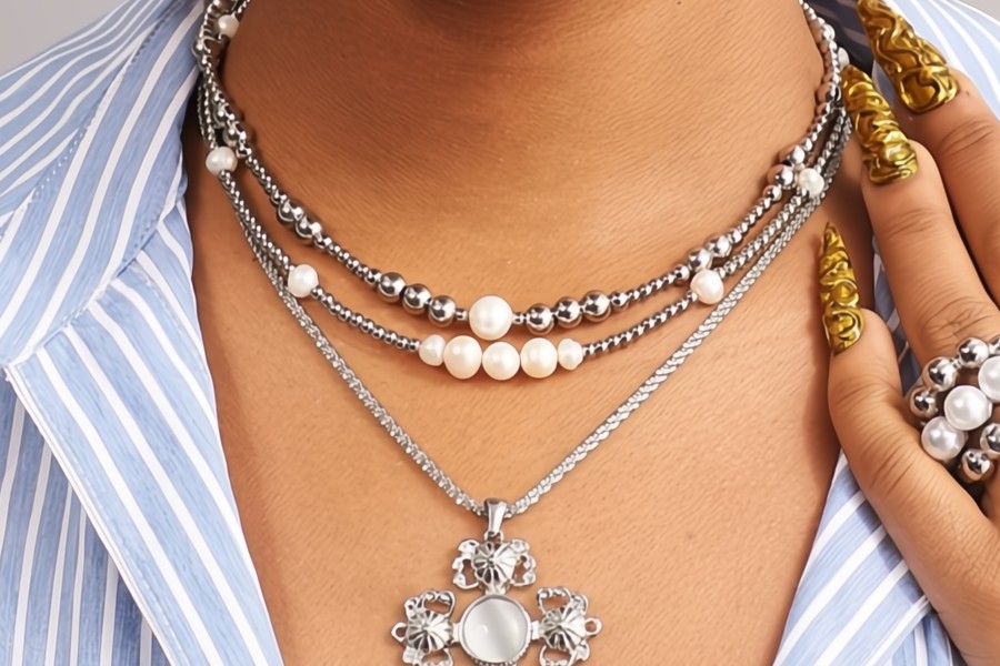 Curated stacks of chains, bangles, and bracelets. Mix metals, textures, and scales for modern opulence.